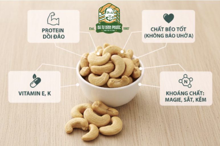 Trong 10gr hạt điều, bạn sẽ nhận được một lượng protein dồi dào, cùng với chất béo tốt, chủ yếu là chất béo không bão hòa – loại chất béo có lợi cho cơ thể. Đặc biệt, hạt điều còn cung cấp nhiều loại vitamin như vitamin E, vitamin K, và một loạt các khoáng chất quan trọng như magie, sắt, và kẽm.