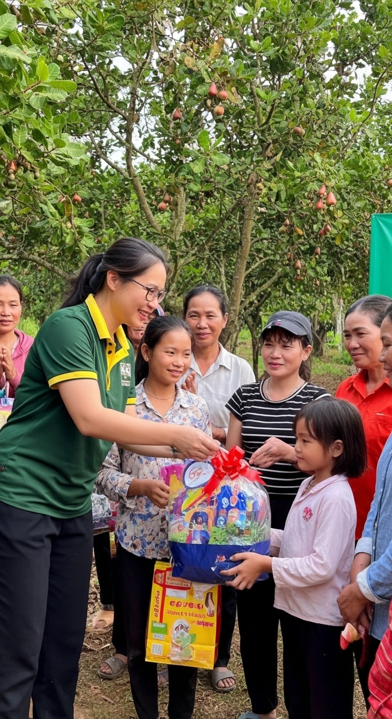 Chúng tôi đầu tư vào giáo dục như đầu tư vào tương lai. Chương trình “Hạt điều & tuổi thơ xanh” mang kiến thức về môi trường, nông nghiệp và lối sống bền vững đến trường học nông thôn.