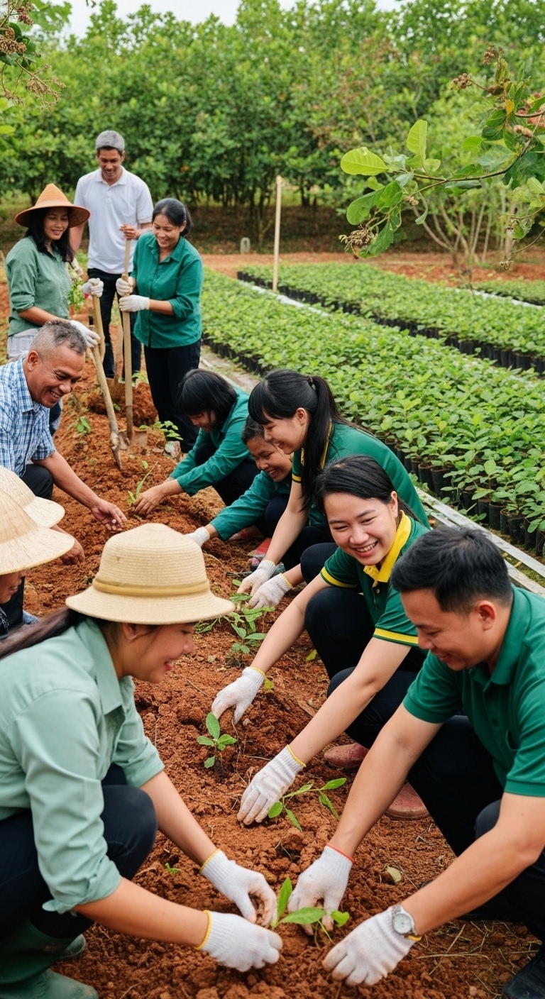 - Trồng 10.000 cây xanh mỗi năm quanh vùng trồng điều.