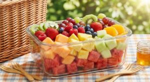 Táo, nho, cam hay dưa hấu cắt sẵn, những món trái cây thanh mát, là cách đơn giản để bổ sung vitamin. Món này không cần chế biến, chỉ cần mang theo bỏ vào túi, nếu bạn muốn tươi hơn có thể bỏ vào ít đá lạnh. Món trái cây thanh mát, tươi ngon sẽ là lựa chọn tuyệt vời cho buổi picnic ngoài trời.
