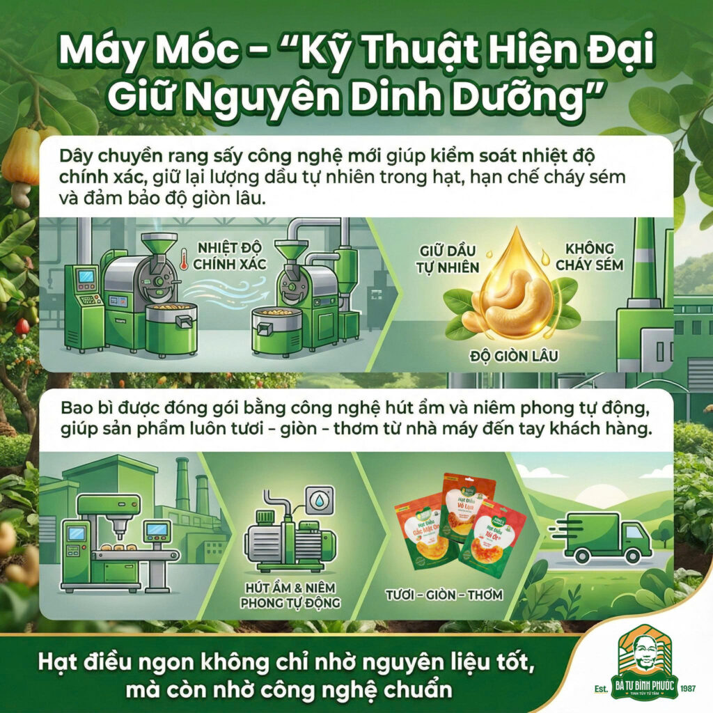 Chúng tôi sử dụng công nghệ hiện đại nhưng vẫn giữ các phương pháp truyền thống, như rang tay thủ công, để đảm bảo hạt điều đạt độ giòn, thơm mà không mất đi hương vị nguyên bản. Quy trình sản xuất sạch, không sử dụng chất bảo quản hay phụ gia hóa học, giúp hạt điều Bà Tư trở thành snack lành mạnh cho mọi gia đình.