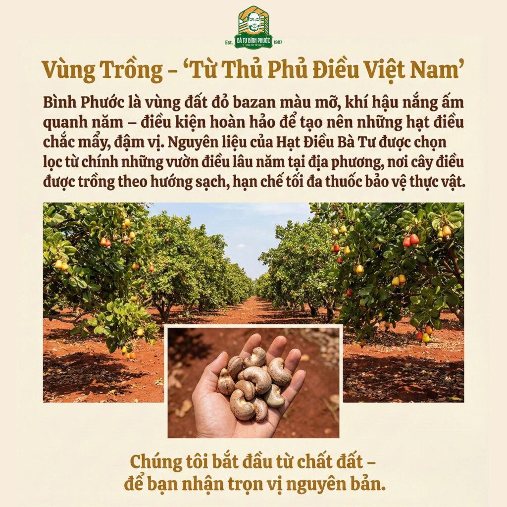 Mua ngay Hạt Điều Bà Tư để thưởng thức hương vị “lành” từ đất trời Bình Phước, nơi mỗi hạt điều là một câu chuyện về thiên nhiên, văn hóa S’tiêng và tình yêu quê hương.