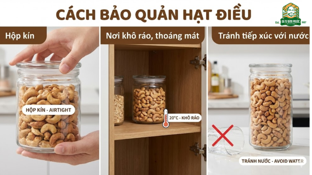 - Giữ trong hộp kín: Đảm bảo không khí không tiếp xúc với hạt điều để tránh chúng bị ẩm và mềm.
