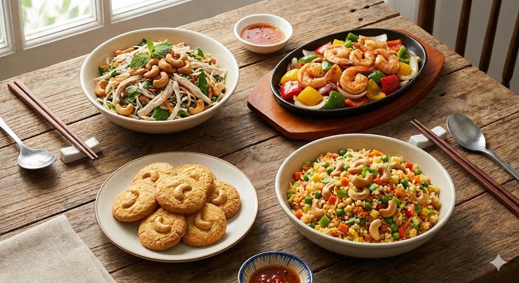 Trong ẩm thực Nam Bộ, hạt điều là nguyên liệu quen thuộc và được người dân sáng tạo, sử dụng trong nhiều món ăn truyền thống, từ các món xào, gỏi đến các loại bánh, góp phần tạo nên hương vị đậm đà, độc đáo. Dưới đây là một số món ăn nổi bật có sự xuất hiện của hạt điều: