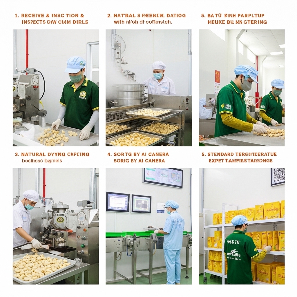 Nhà máy Bà Tư Bình Phước là một trong những cơ sở chế biến hạt điều hiện đại nhất Việt Nam, đạt chuẩn quốc tế “ISO 22000:2018, HACCP, BRC và Organic”. Tại đây, mỗi hạt điều được chăm chút qua từng công đoạn bằng “công nghệ thông minh và bàn tay tỉ mỉ của người thợ Việt”.
