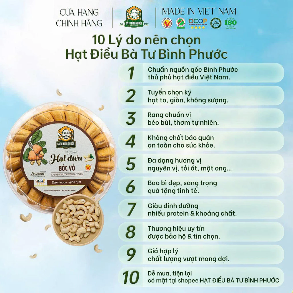 - Tên sản phẩm: Hạt Điều Bóc Vỏ (Nhân Trắng) Rang Củi Bà Tư Bình Phước