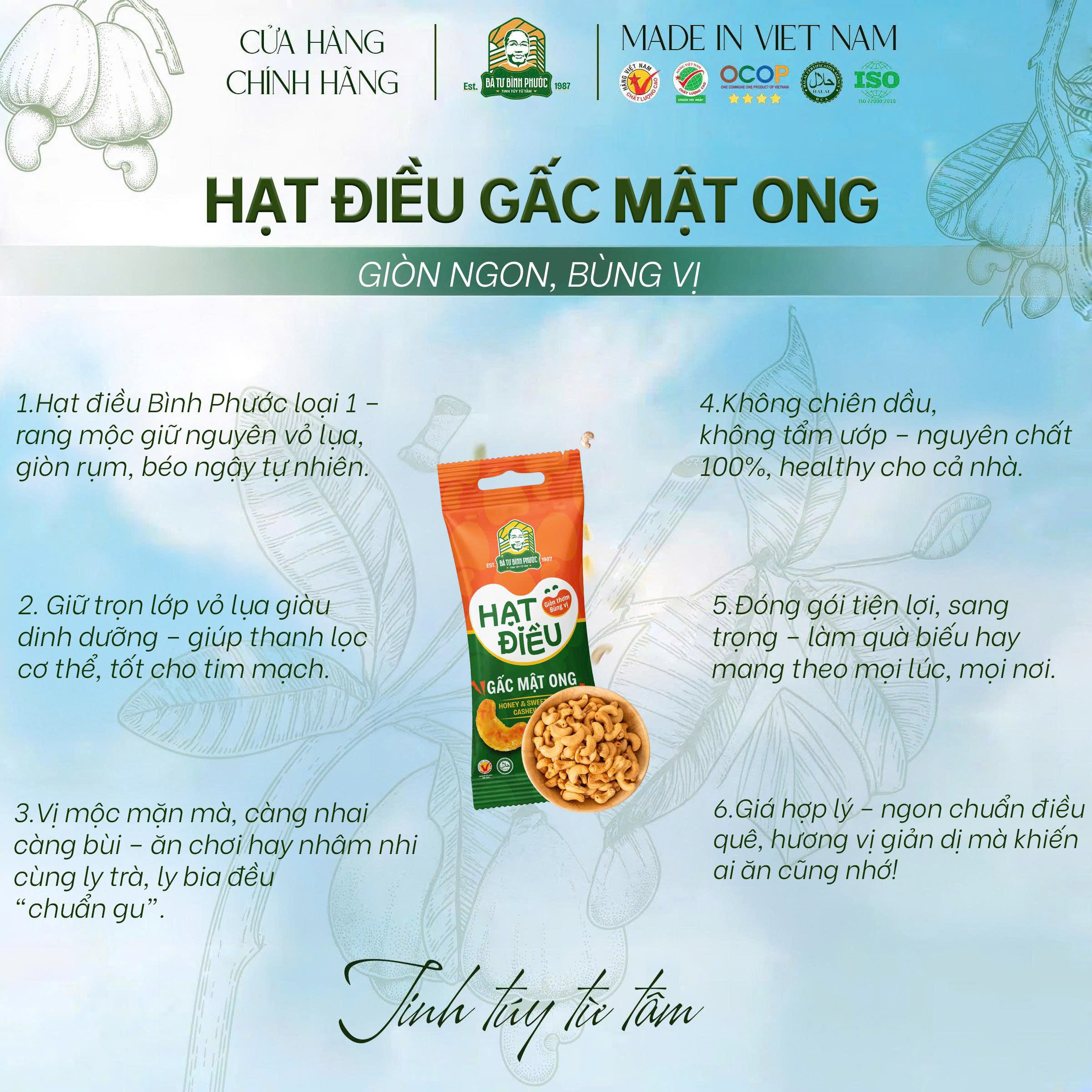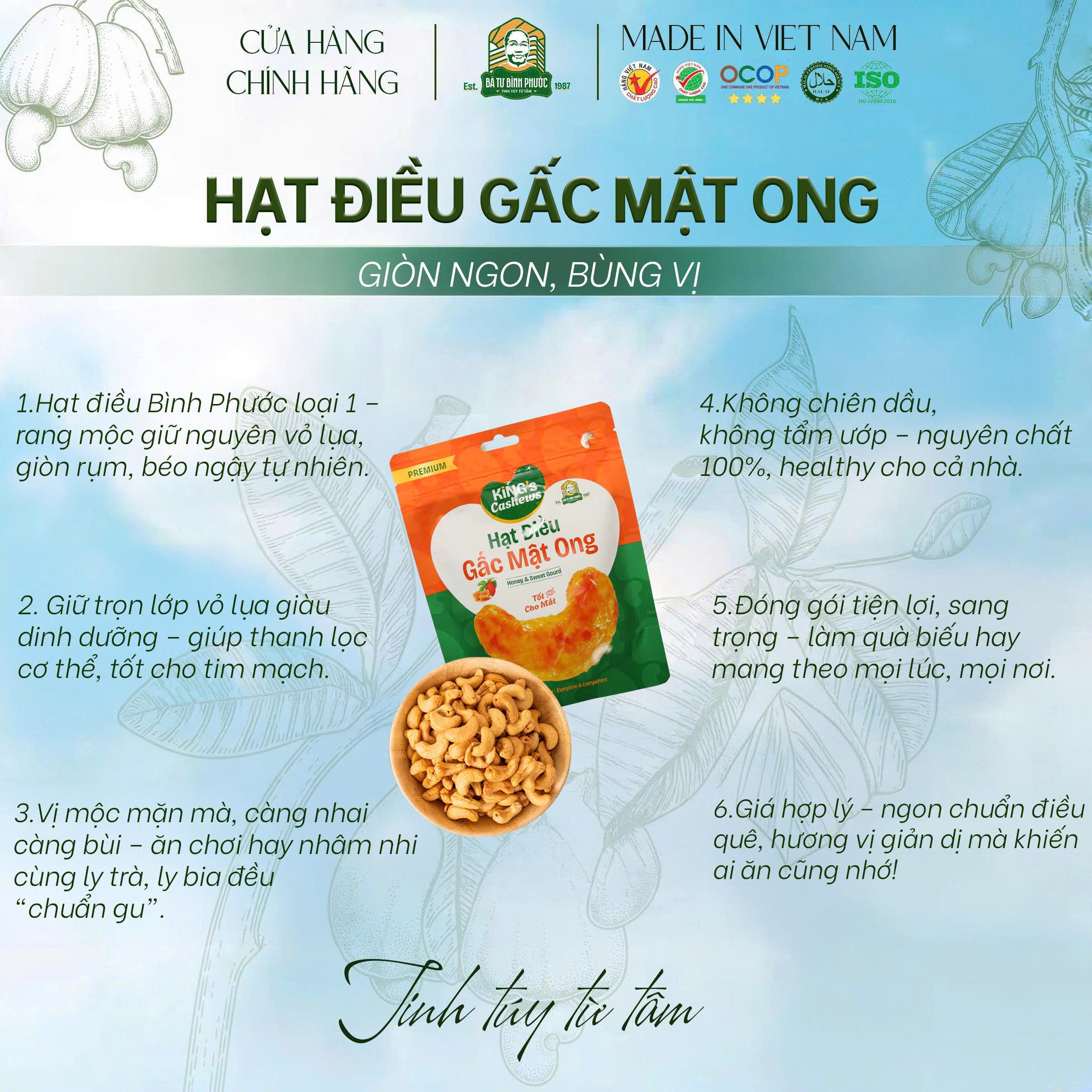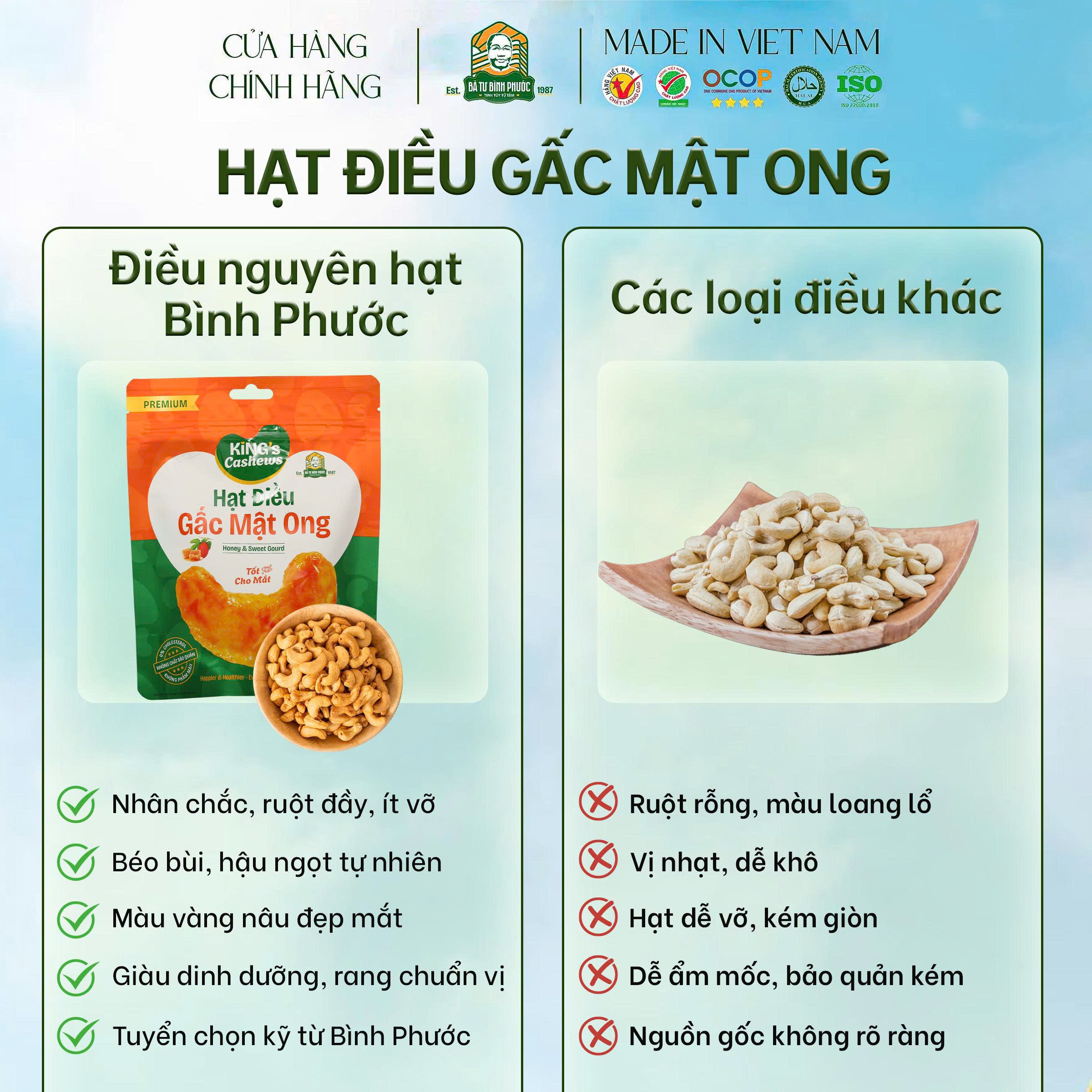 – 100% hạt điều Bình Phước loại 1, rang thủ công, không pha trộn.