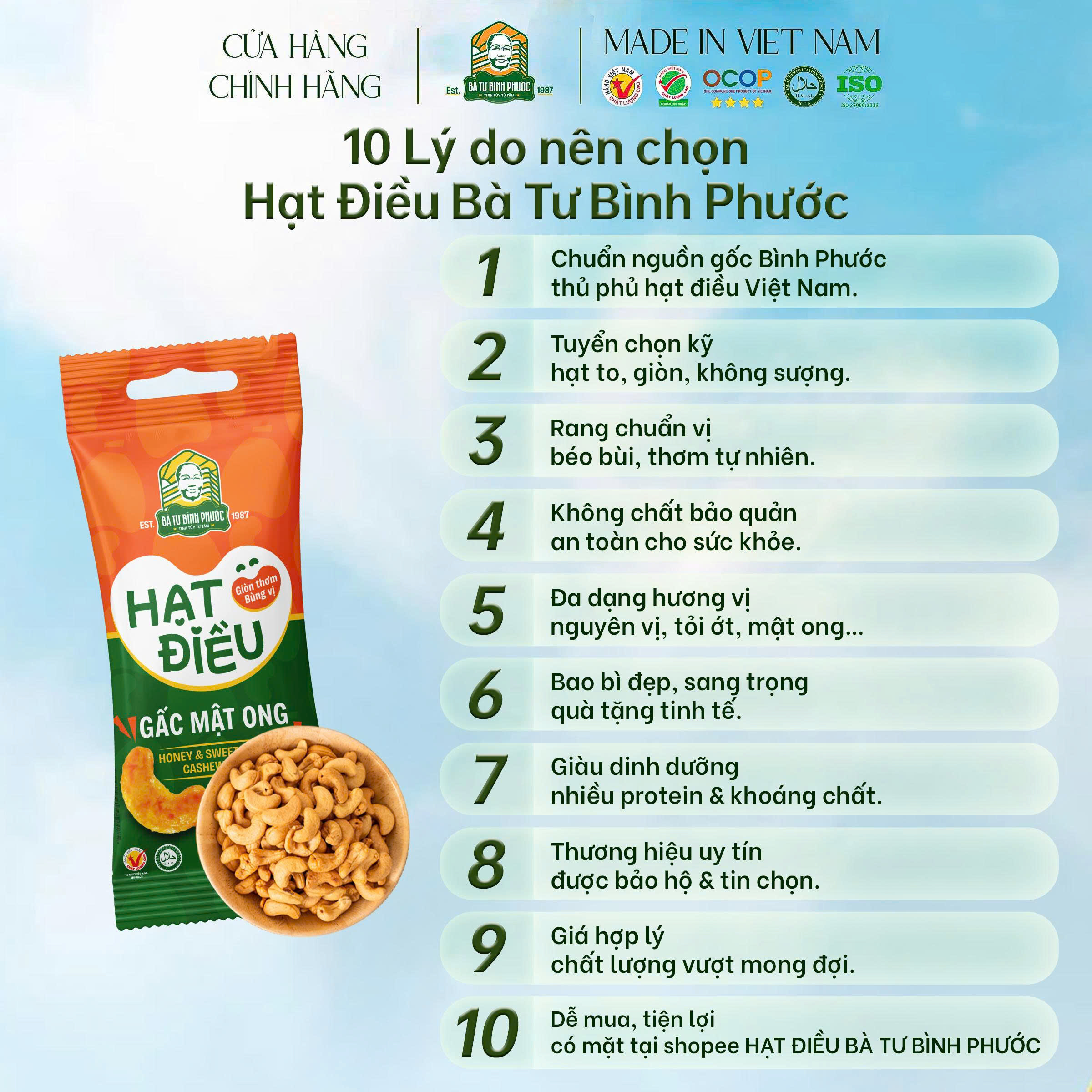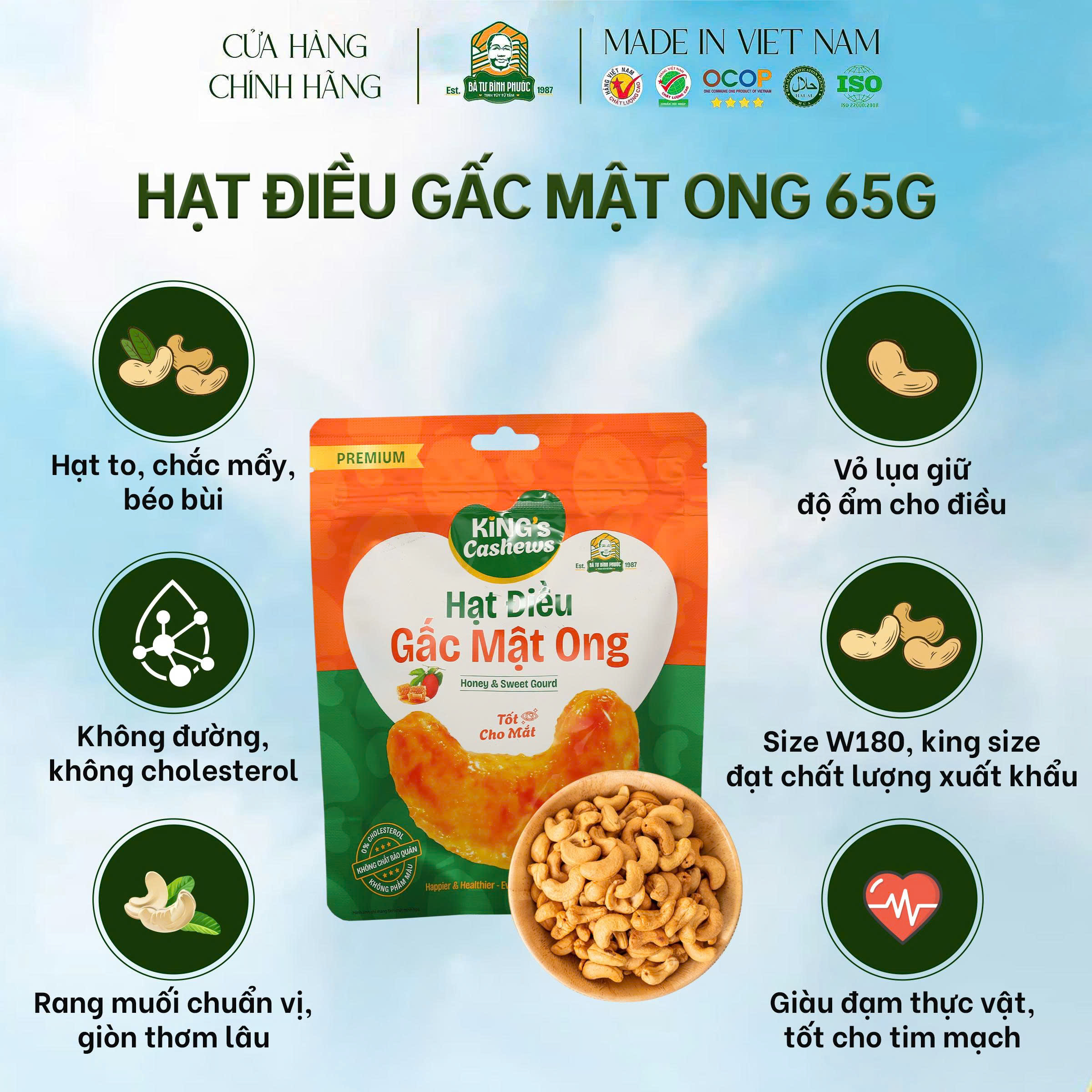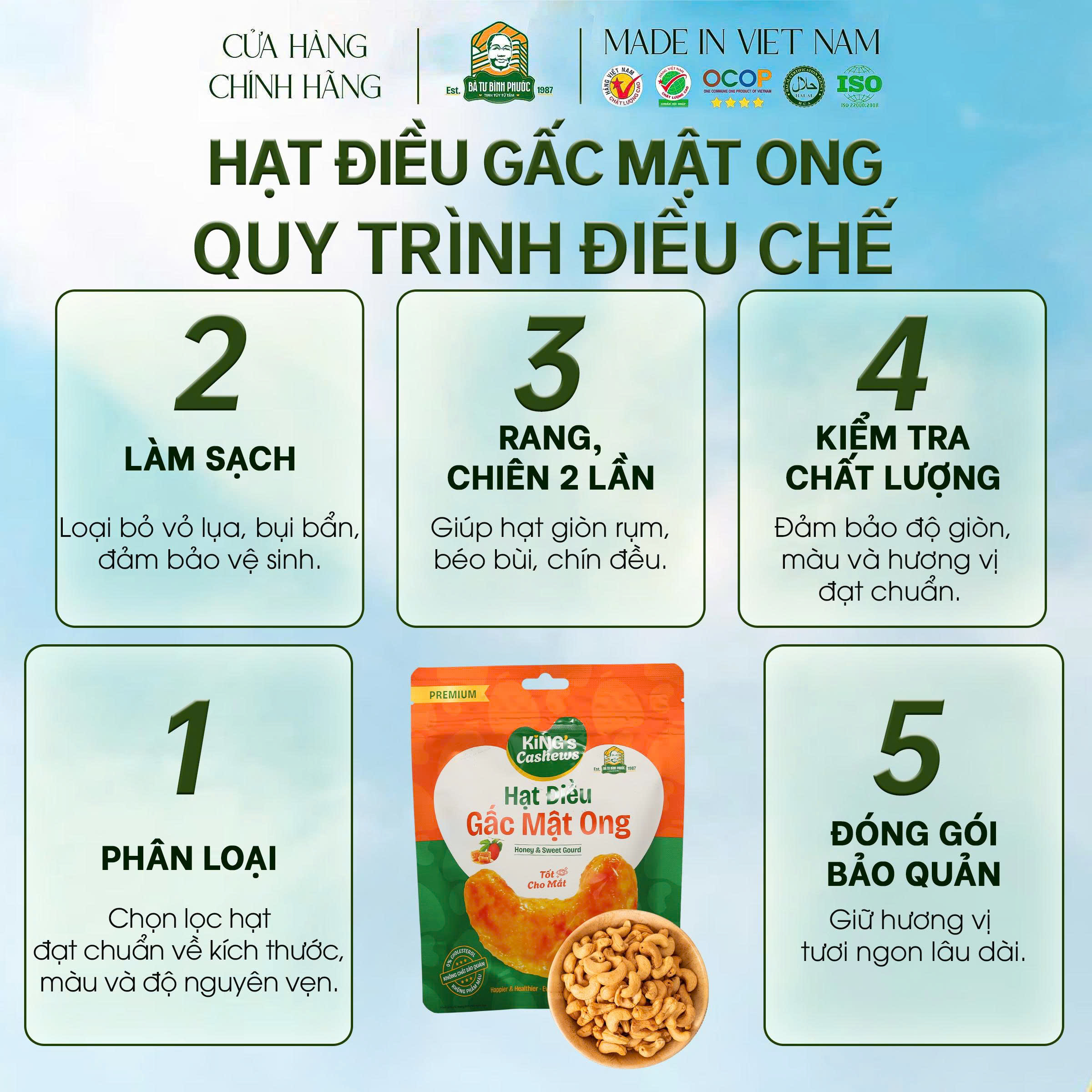 – 100% hạt điều Bình Phước loại 1, rang thủ công, không pha trộn.