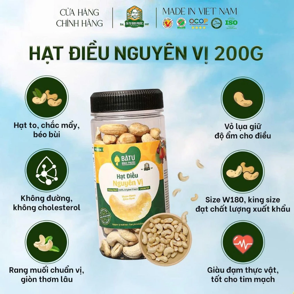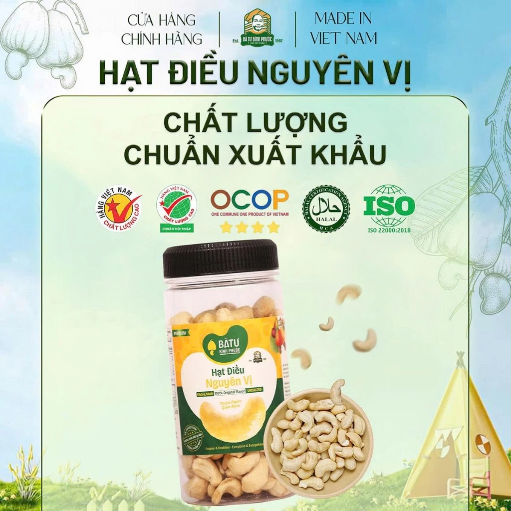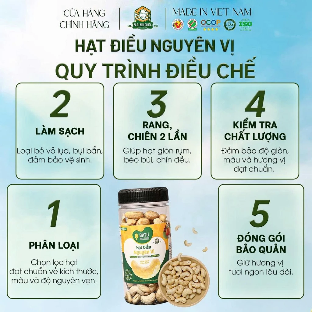 Cam kết 100% từ Hạt Điều Bà Tư ✔ Rang mới mỗi ngày, giao hạt mới nhất ✔ Không pha hạt Campuchia, không hạt lép, không hạt sâu ✔ Đổi trả miễn phí 1-1 nếu hạt ẩm, mất độ giòn ✔ Giao hàng toàn quốc – Freeship đơn từ 500k (hoặc tùy chương trình)