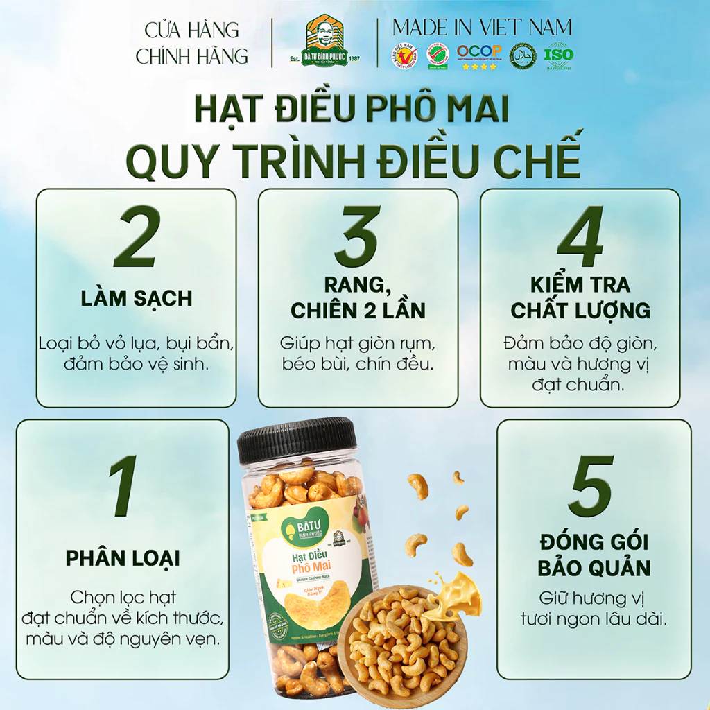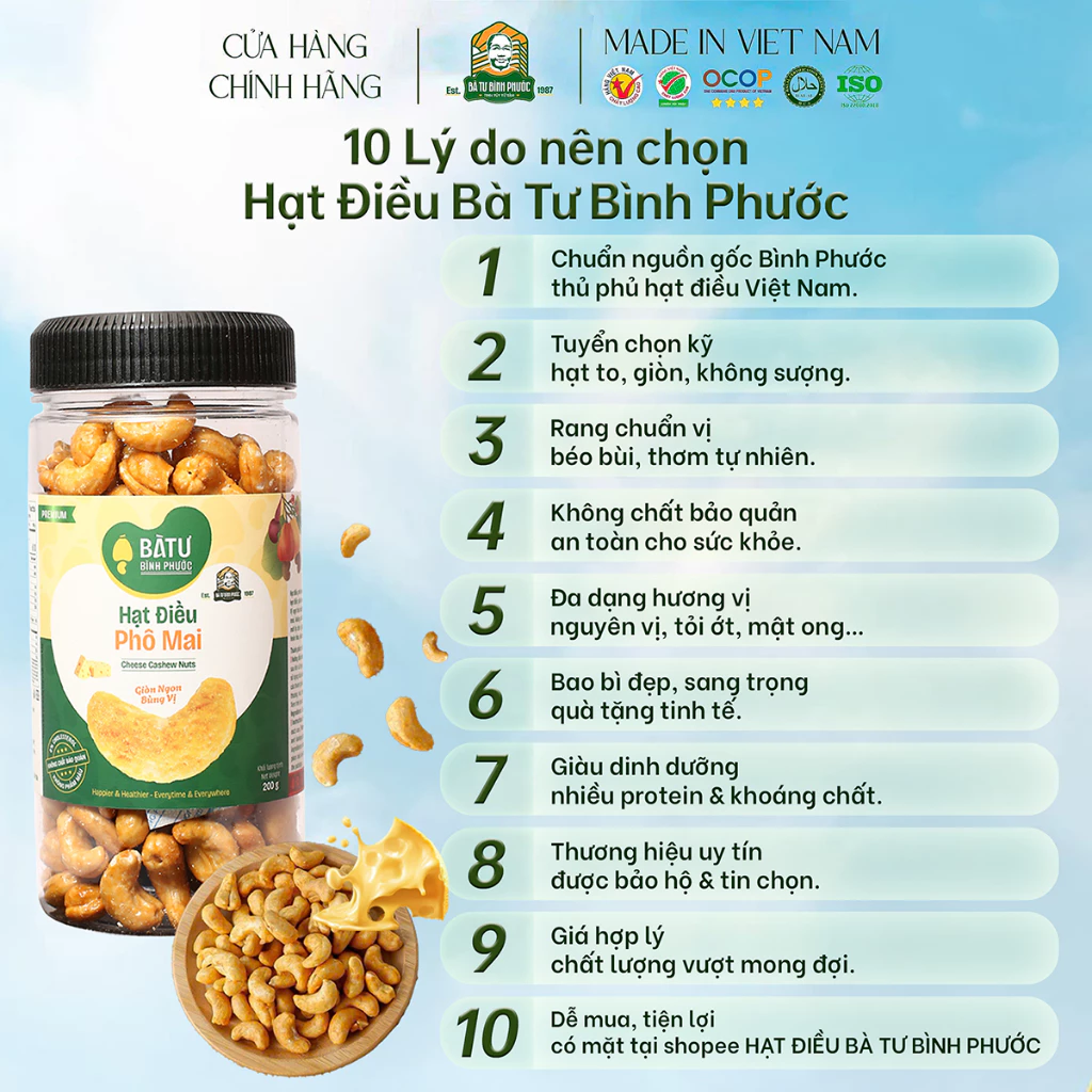 Cam kết vàng từ Hạt Điều Bà Tư ✔ Rang mới mỗi ngày – 100% hạt điều Bình Phước chính gốc ✔ Không dầu chiên – Không chất bảo quản – Không phẩm màu ✔ Đổi trả 1-1 nếu hạt lỗi, ẩm mốc, mất vị phô mai ✔ Giao hàng toàn quốc – Freeship từ 500k (hoặc tùy chương trình)