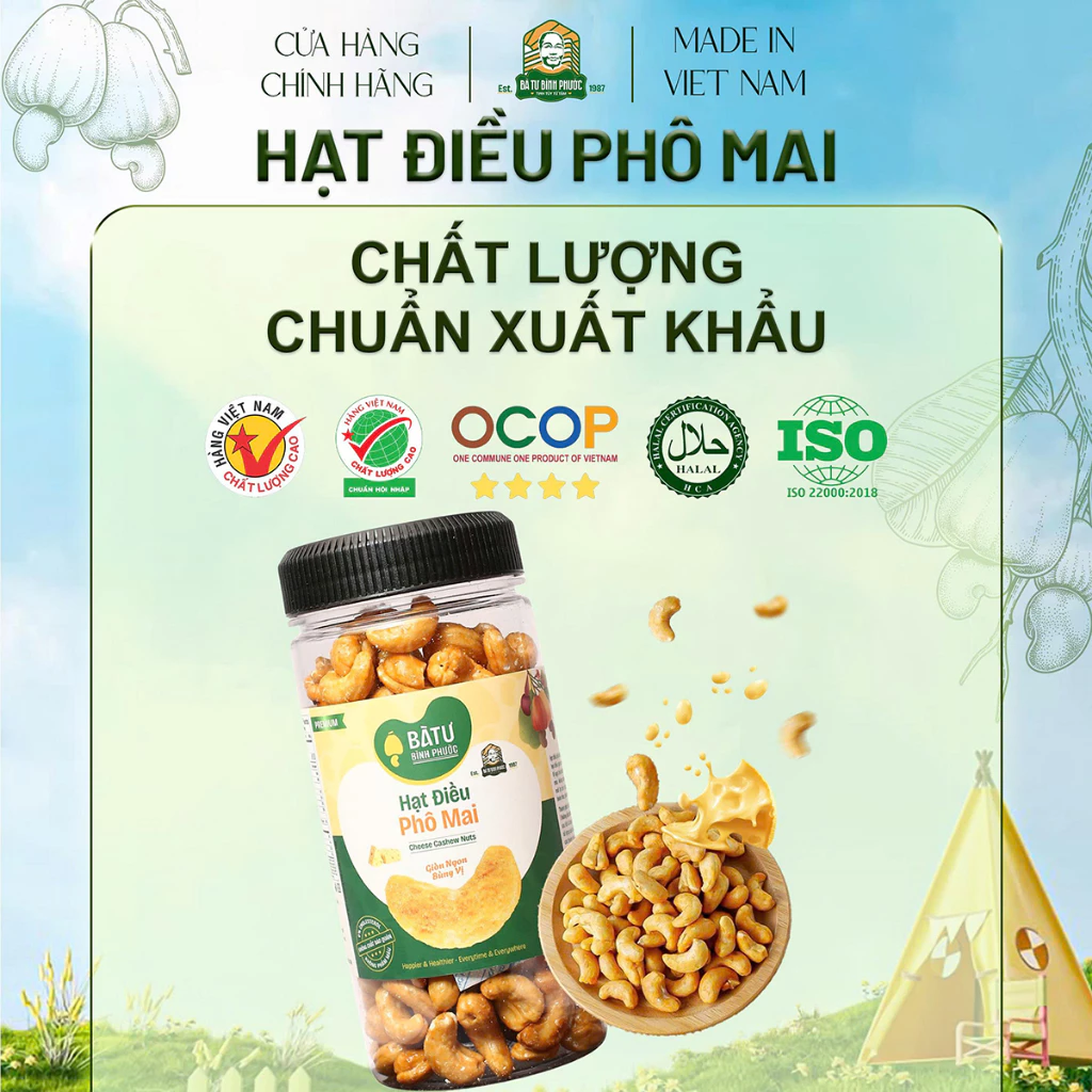 - Thành phần: Hạt điều nhân trắng loại 1 + bột phô mai cao cấp + đường + muối tinh khiết