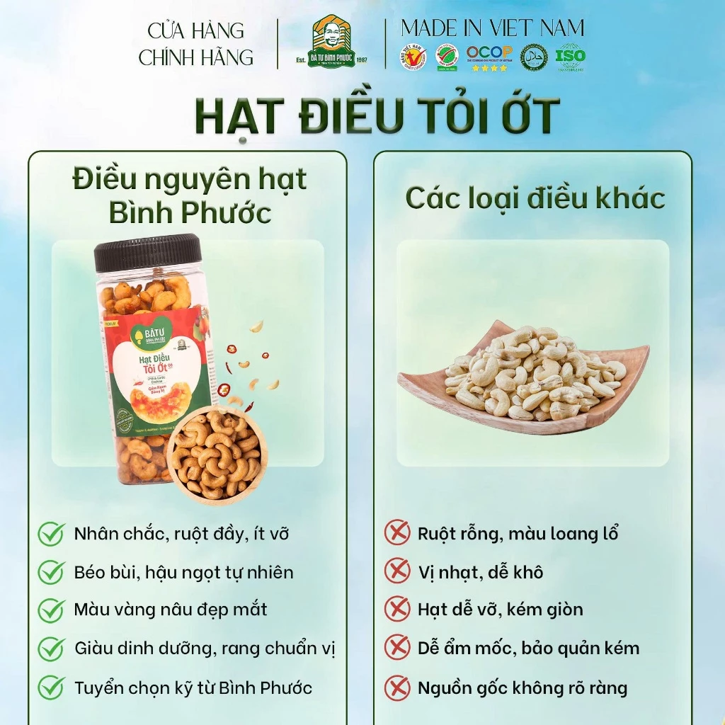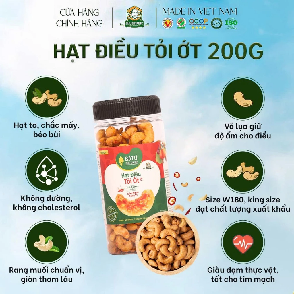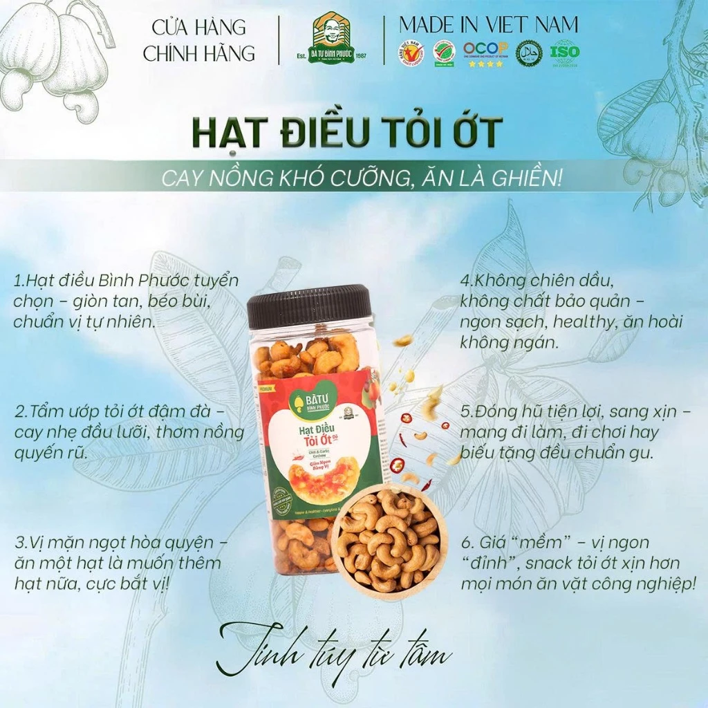 Từ những nông trại chất lượng cao trên đất đỏ bazan Bù Gia Mập – thủ phủ hạt điều Việt Nam, Hạt Điều Tỏi Ớt Bà Tư 200g được chế biến hoàn toàn trong nhà máy chất lượng cao theo bí quyết rang củi thủ công 38 năm tuổi. Hạt điều nhân trắng loại 1 to tròn, chắc thịt được con người chất lượng cao chọn lọc kỹ càng, rang chậm trên lửa củi rừng khô, sau đó phủ lớp tỏi phi vàng giòn và ớt đỏ tươi cay nhẹ – tạo nên vị cay mặn hài hòa, thơm nức mũi, giòn rụm đến hạt cuối cùng.