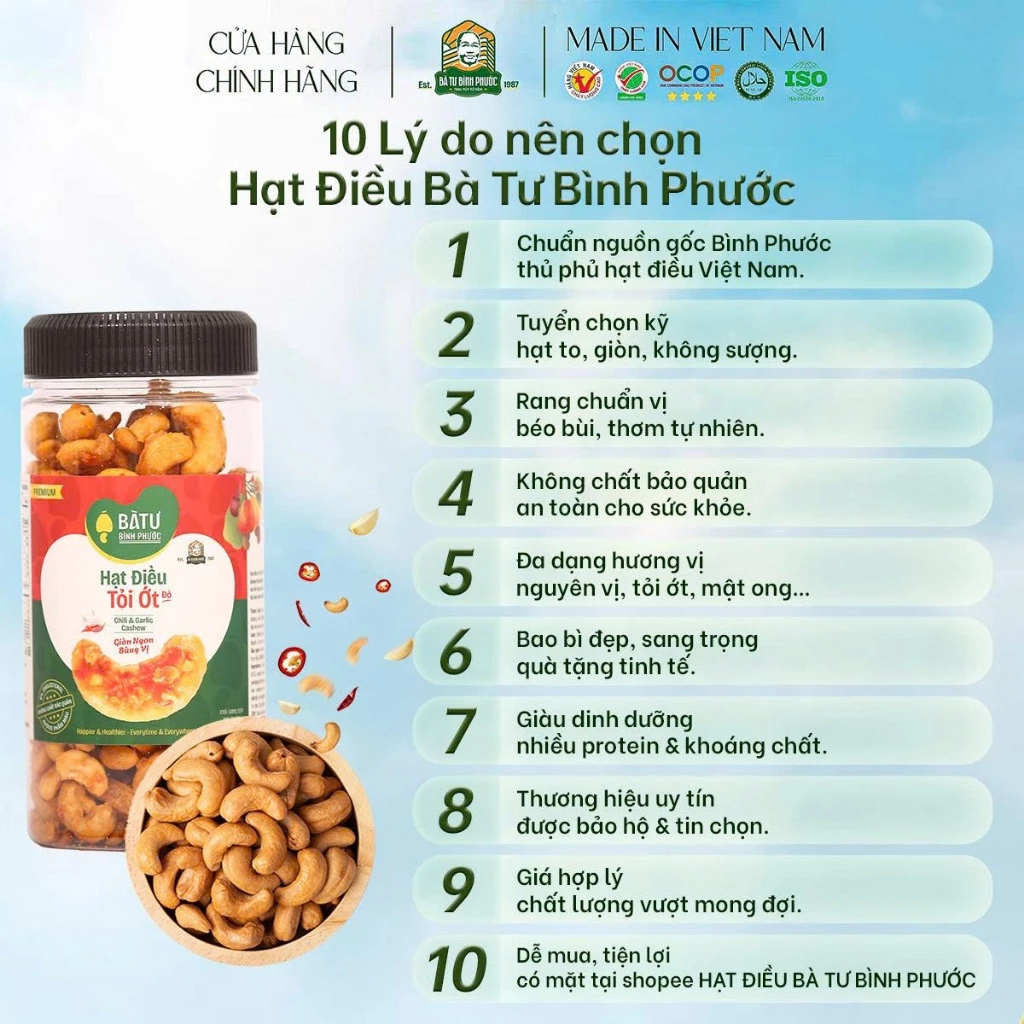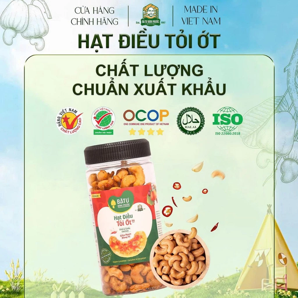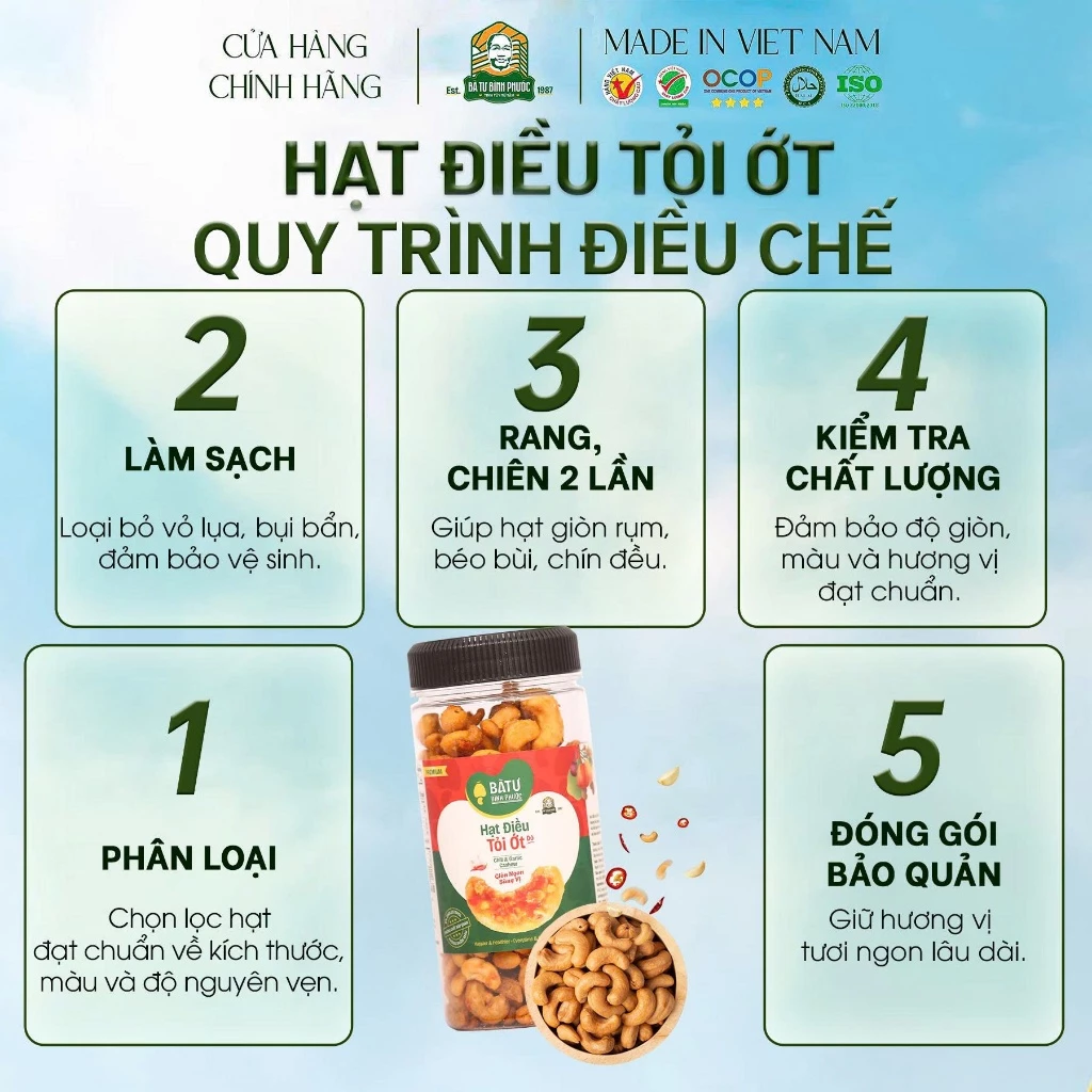 Từ những nông trại chất lượng cao trên đất đỏ bazan Bù Gia Mập – thủ phủ hạt điều Việt Nam, Hạt Điều Tỏi Ớt Bà Tư 200g được chế biến hoàn toàn trong nhà máy chất lượng cao theo bí quyết rang củi thủ công 38 năm tuổi. Hạt điều nhân trắng loại 1 to tròn, chắc thịt được con người chất lượng cao chọn lọc kỹ càng, rang chậm trên lửa củi rừng khô, sau đó phủ lớp tỏi phi vàng giòn và ớt đỏ tươi cay nhẹ – tạo nên vị cay mặn hài hòa, thơm nức mũi, giòn rụm đến hạt cuối cùng.