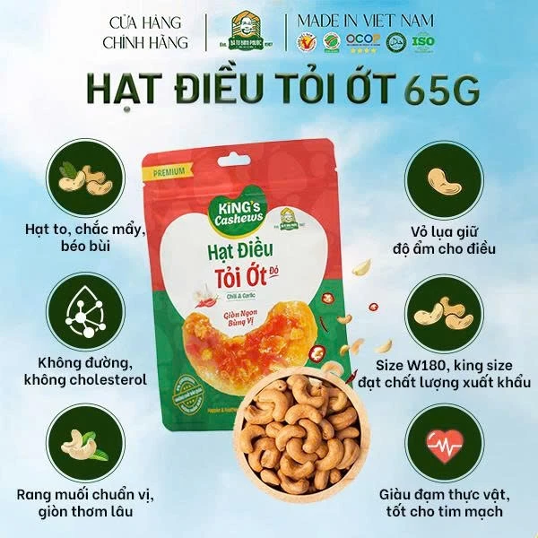 - Thành phần: Hạt điều nhân trắng loại 1, tỏi phi vàng, ớt đỏ tươi, muối biển, đường, tiêu – 100% tự nhiên