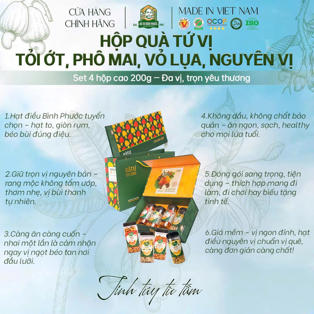 - Bốn hương vị – Bốn lời chúc phúc – Một hộp quà trọn vẹn 🌶️ Tỏi Ớt: Cay nồng đậm đà – Chúc phát tài, khởi sự hanh thông 🧀 Phô Mai: Béo ngậy tan chảy – Chúc viên mãn, thịnh vượng 🌿 Vỏ Lụa: Mộc mạc nguyên bản – Chúc bình an, trường tồn 🥜 Nguyên Vị: Thuần khiết thanh tao – Chúc sức khỏe dồi dào, an khang
