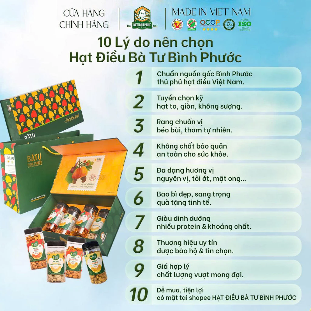 Bạn đang tìm hộp quà hạt điều cao cấp để biếu Tết, biếu đối tác, biếu sếp, biếu gia đình? Bạn muốn món quà vừa đẹp lung linh, vừa chất lượng cao, vừa mang đậm hồn Việt và câu chuyện cảm động 38 năm?