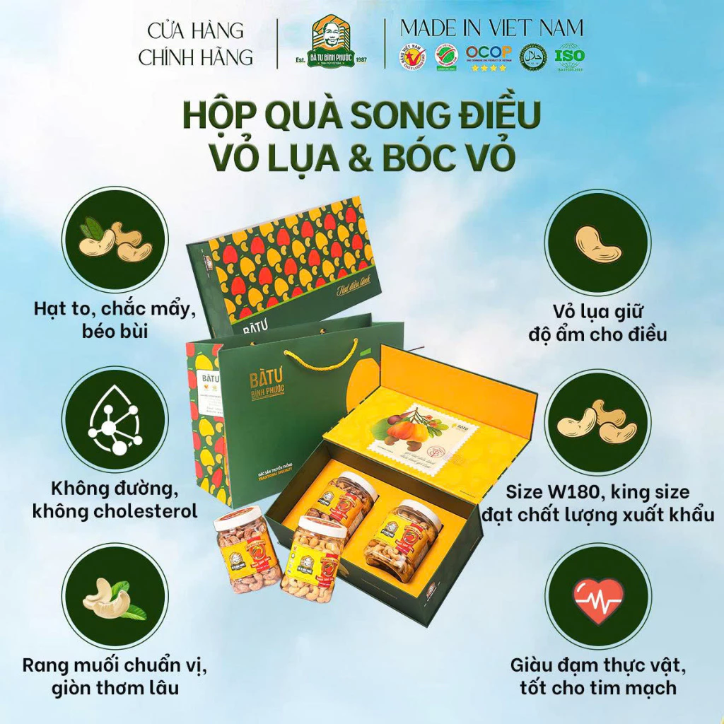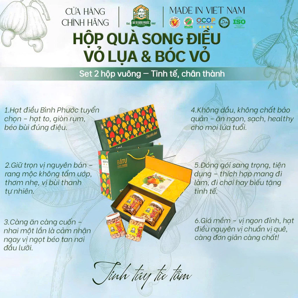 Bạn đang tìm quà Tết hạt điều cao cấp, vừa sang trọng, vừa tốt cho sức khỏe, lại mang ý nghĩa “Trao điều lành – Gửi trọn tâm ý”? Hộp Quà Song Điều Bà Tư Bình Phước chính là lựa chọn hoàn hảo dành cho bạn!