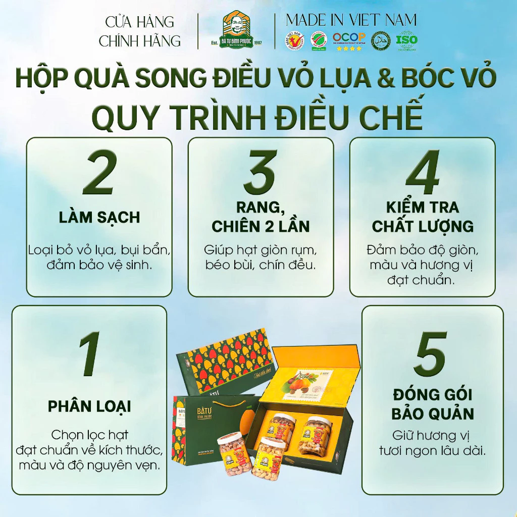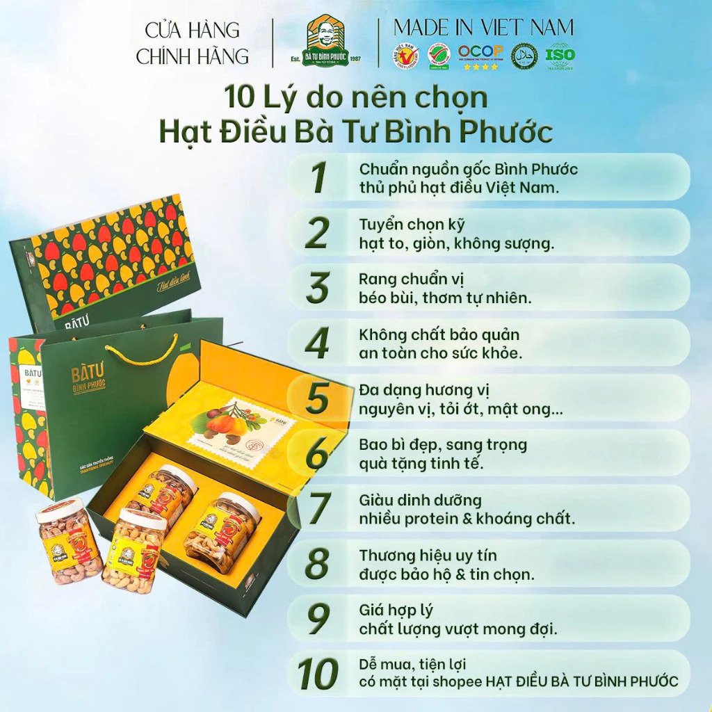 - Nguồn gốc rõ ràng từ thủ phủ hạt điều Việt Nam – Bình Phước: 100% hạt điều nhân loại 1, tuyển chọn kỹ từ vùng đất đỏ bazan trứ danh.